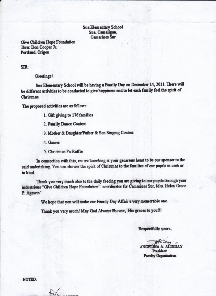 This letter was forwarded to us by Helen, our Sua Elementary School representative. We have been asked to fund the cost of a Family Day held at the school. We feel this is an important celebration because families are of key importance, and we especially want our sponsored children to enjoy the blessing of having loved ones that care. Thank you for all of your support in making this happen.