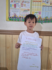 “Thank you very much for sponsoring our hot soup everyday. It is a big help for my parents who can’t afford to give us our baon (provisions like food or money). May the God Almighty give you all long life and more blessings to come. I love you all” – Nathaniel Noriega