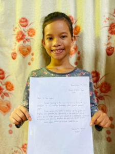 “I am writing this letter in behalf of my family to express our gratitude for sponsoring us like food, rice, clothes when I was in kindergarten until present. It is extremely wonderful to receive such generous donation. We appreciate all your kindness. Once again, thank you so much. God bless po. ”