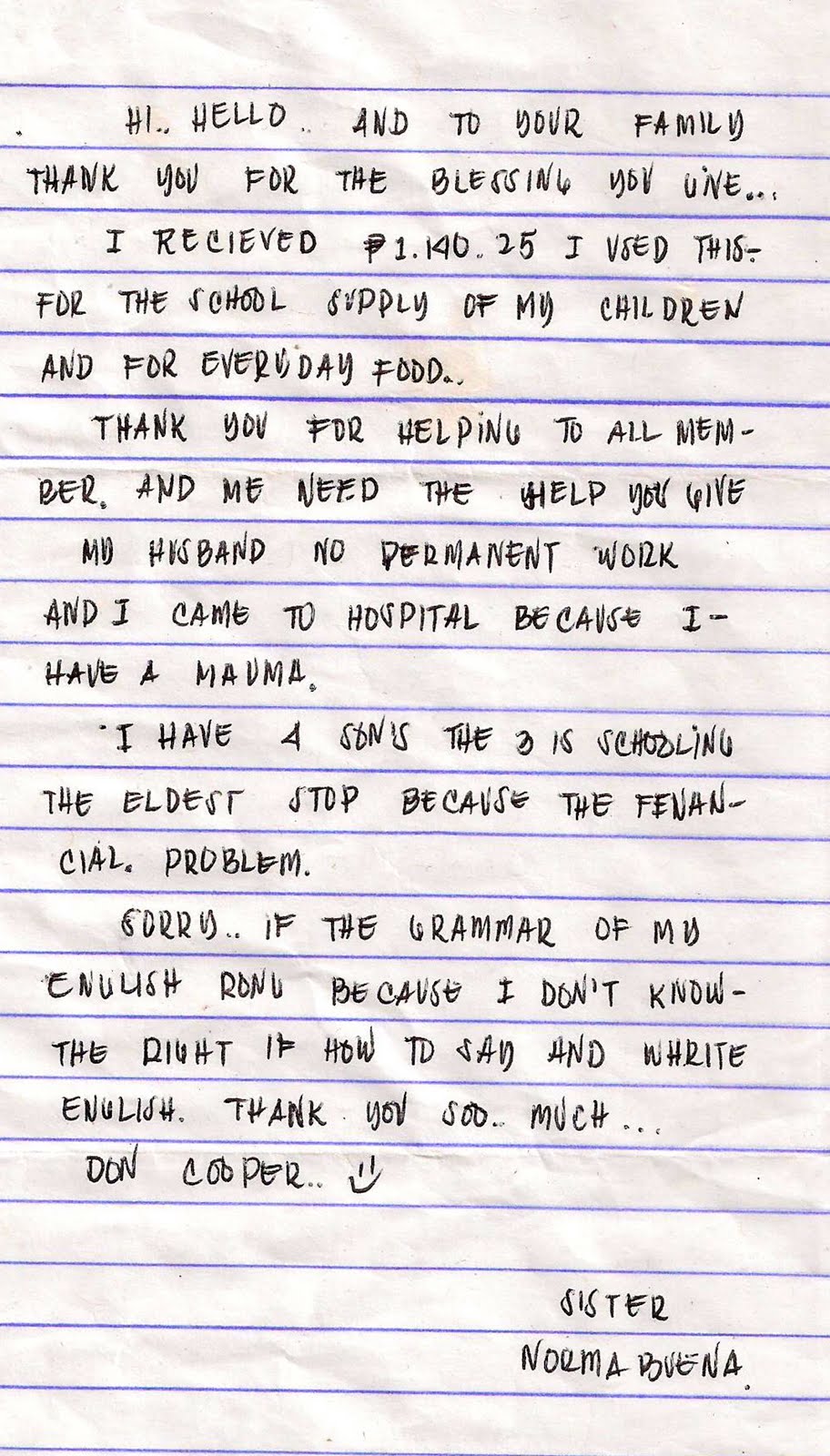 Hello Uncle Don and Auntie Cathy, I already picked up the money this afternoon after of my class. Thank you very much uncle don and auntie cathy , I payed already the down payment and my prelim exam. Only the midterm, pre-final and final will be payed on during before the exam. It has P500 peso [...]
