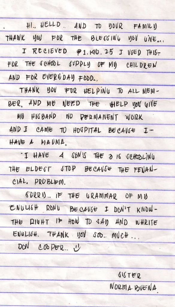 Sweet Letter of Appreciation Your donations are making a difference in people’s lives. What a great feeling to know this and to know they appreciate your kindness. Give-Children-Hope2017-12-05T09:28:02-08:00July 30th, 2010|Sponsor Updates & Appreciation| Share This Post FacebookXLinkedInPinterest Related Posts Another blessing, thank you Steve Cooper Gallery Another blessing, thank you Steve Cooper December 5th, 2017 | 0 Comments Happy Thanksgiving Gallery Happy Thanksgiving December 5th, 2017 | 0 Comments Letters of Appreciation Gallery Letters of Appreciation February 2nd, 2014 | 0 Comments Merry Christmas Gallery Merry Christmas December 25th, 2012 | 0 Comments September Update Gallery September Update October 18th, 2012 | 0 Comments Leave A Comment Cancel replyComment Δ